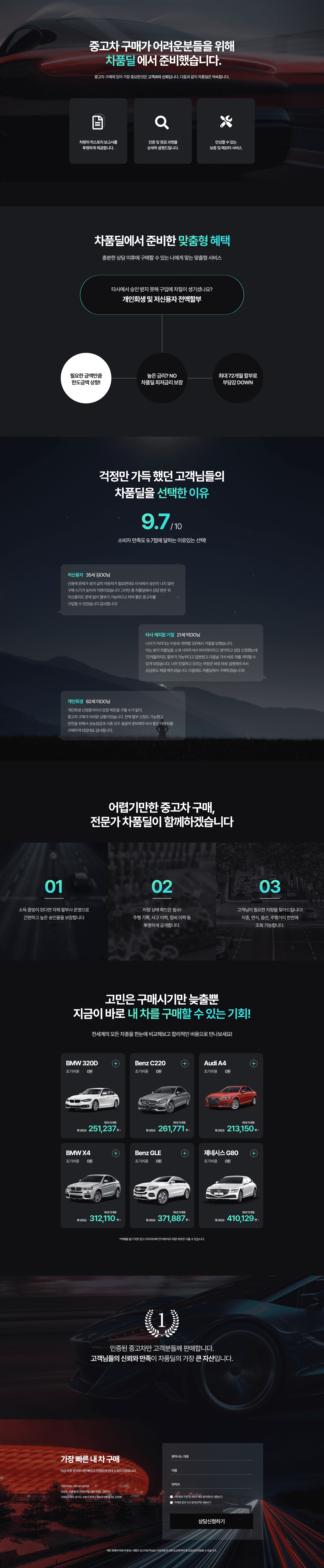 - 3단 구성: 불안 해소 → 혜택 안내 → 후기/신뢰 지표 → 차량 리스트 → 빠른 문의 흐름으로 구성