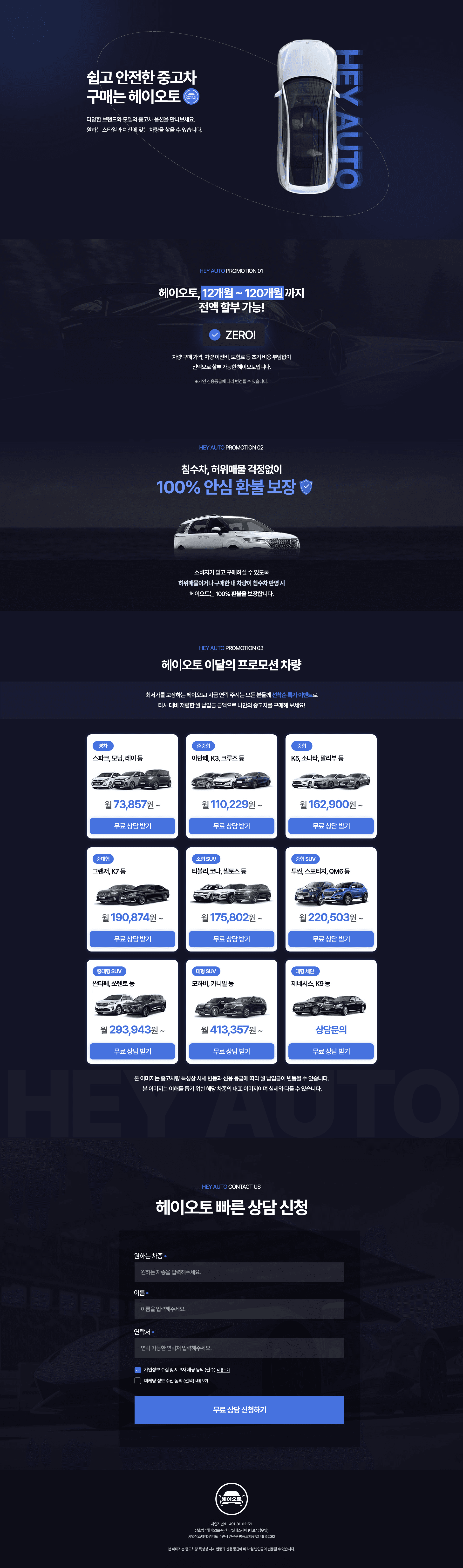 - 중고차 구매에 대한 부담을 줄이고, 금융 혜택과 보장 제도를 강조한 프로모션 중심 랜딩페이지 제작