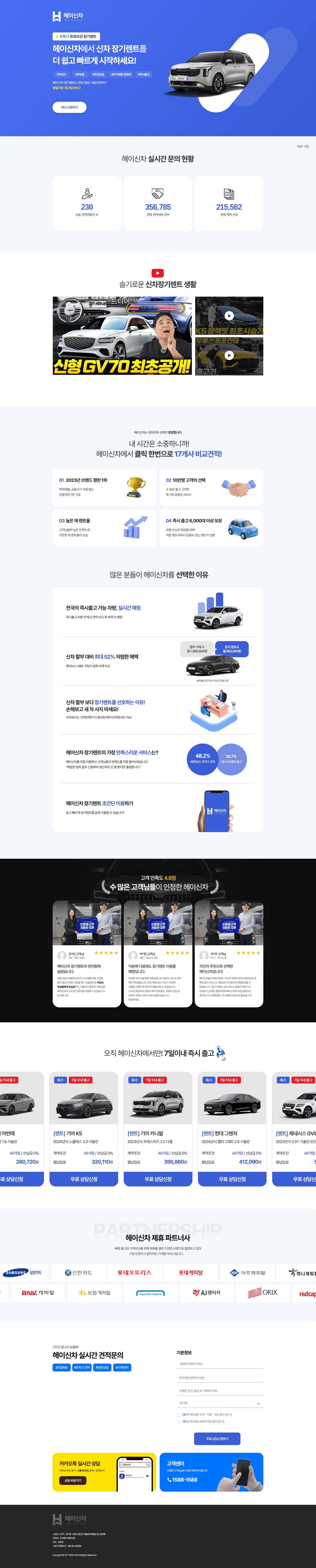 - 신차 장기렌트에 대한 비교견적 문의를 유도하고, 후기 및 실시간 데이터를 통해 신뢰도 확보